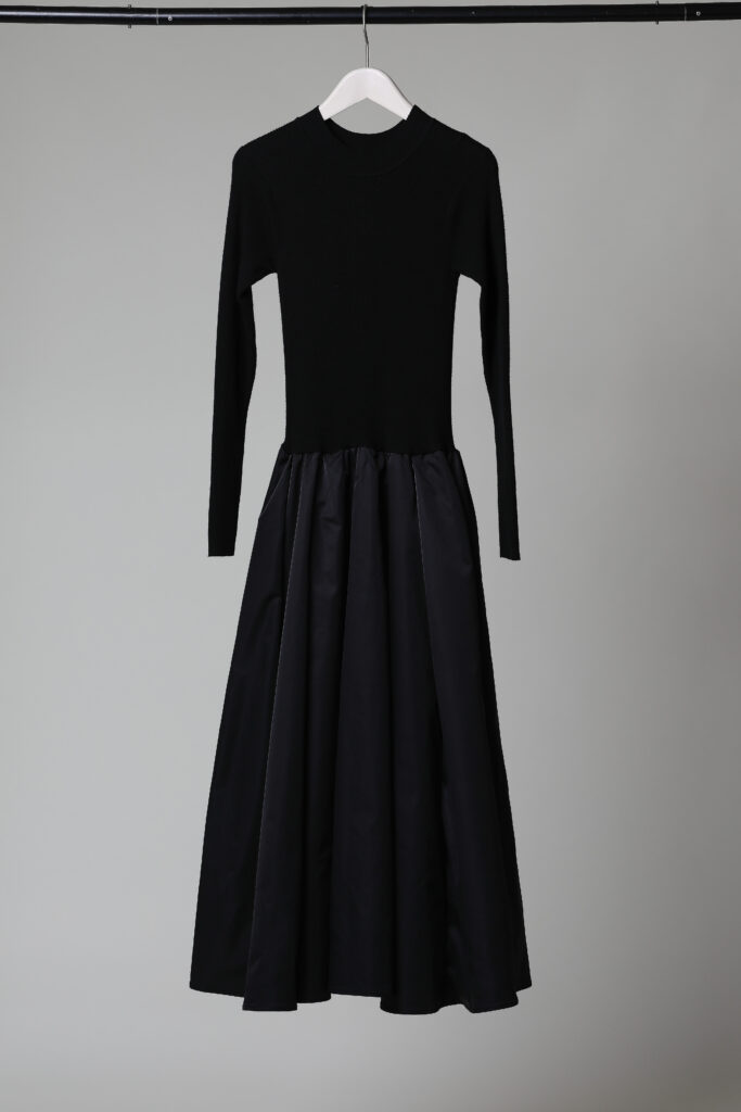 アパレルブランドR様の新作として制作した異素材使いが目を引くニットワンピース。身頃の上部には体に心地よくフィットする生地を、下部には柔らかな広がりを見せるフレア生地を採用し、一着の中で絶妙なコントラストを表現しました。ヒップや脚のラインをさりげなくカバーする設計にこだわっているため、体型を気にせずどなたでも美しく着こなすことができます。動作に合わせて裾がふわりと揺れ動く、軽やかで表情豊かなシルエットも魅力です。